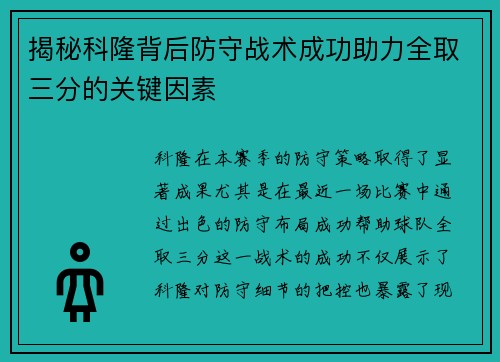揭秘科隆背后防守战术成功助力全取三分的关键因素