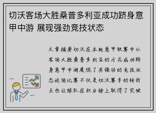 文章摘要:切沃在本轮意甲联赛中,以客场大胜桑普多利亚的方式成功跻身意甲中游,展现了其强劲的竞技状态。这场比赛不仅是切沃赛季的转折点,也让球队在积分榜上取得了突破性的进展。通过出色的团队协作、战术执行、...