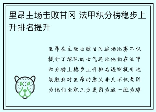 里昂主场击败甘冈 法甲积分榜稳步上升排名提升