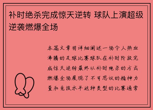本篇文章将详细阐述一场令人热血沸腾的足球比赛,球队在补时阶段完成惊天逆转,最终以补时绝杀的方式燃爆全场,展现了不可思议的精神力量和竞技水平。这种类型的比赛通常充满悬念和反转,而本场比赛更是让球迷们记忆犹新。从比赛初期的劣势局面到补时阶段的绝...