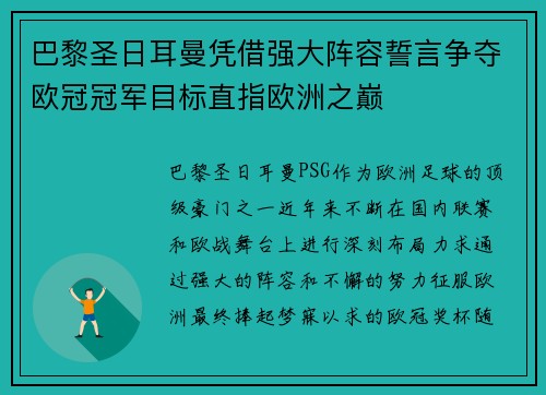 巴黎圣日耳曼凭借强大阵容誓言争夺欧冠冠军目标直指欧洲之巅